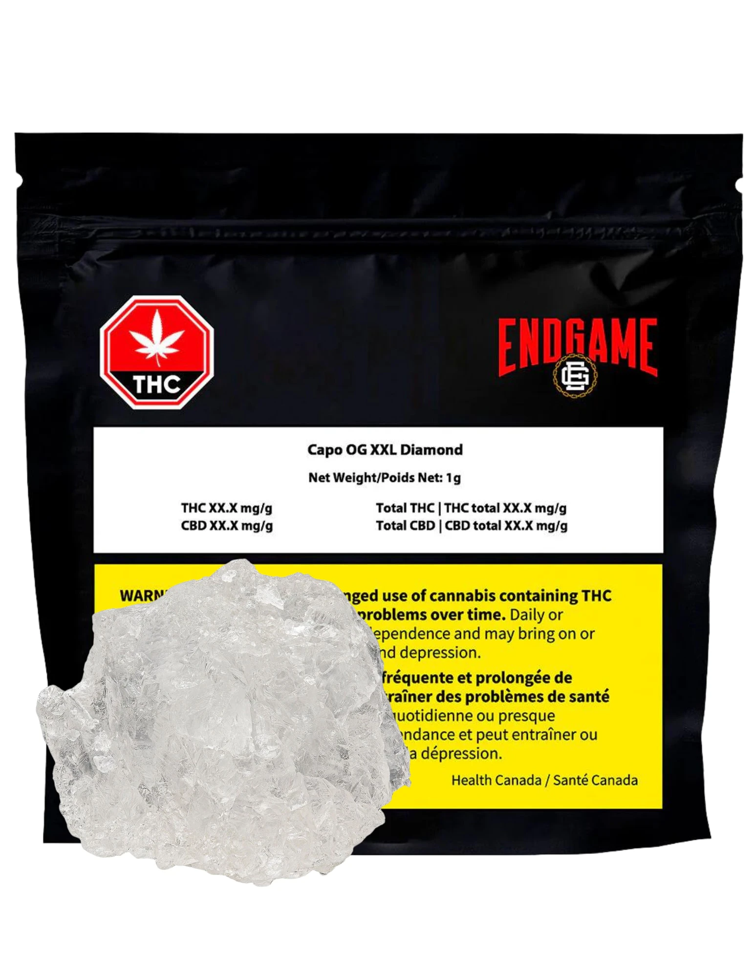 The crown jewel of Endgame diamond concentrates. We're offering this limited drop containing a full-gram THCA Diamond lightly coated in terps. A big 'ol rock to dab or to bussdown what ever you're rolling. Limited run, get them before they are gone.