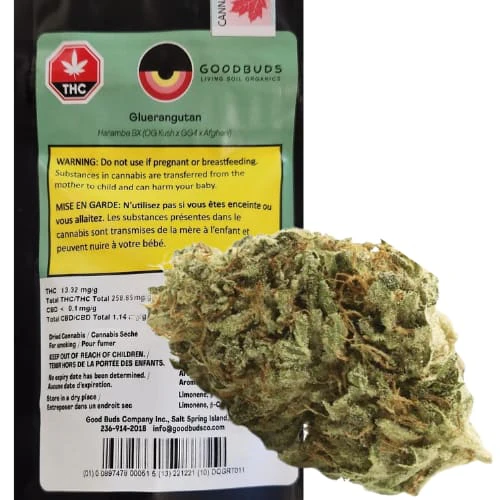 A back-cross of the rare glue strain Harambe, Gluerangutan smells like a classic OG with notes of pine, earth and fuel, balanced by sweet citrus. Grown organically on Salt Spring Island, BC, it's small batch, hang dried and hand trimmed.