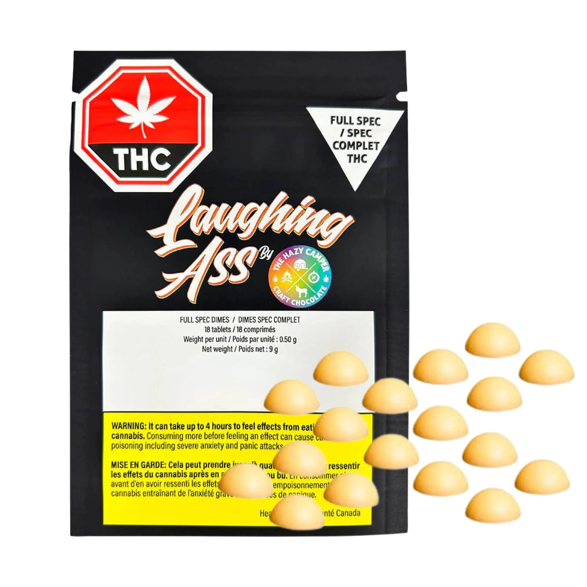 Weed for your tongue instead of your lungs. Laughing Ass brings you Full Spectrum THC oil infused tablets made of fat soluble cocoa butter. Enjoy the easy dosing 10 mg tablets that melt away in your mouth, with a mild and pleasing cannabis flavour.