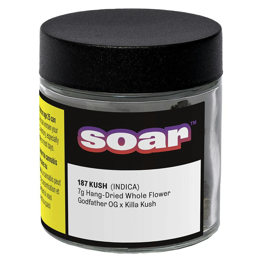 Look out for 187 Kush, a killer combo of the notorious Godfather OG x Killa Kush. Soar's most potent cultivar yet, this powerhouse indica boasts a potency range of 28-34% THC. Beyond its powerful potency, its highly expressive aromatics hit just as hard with notes of pulverized blueberries, sugary jam, sweet vanilla cake, and a hint of kushy spice from dominant terpenes myrcene, humulene and caryophyllene. Its tight, dark green buds are long and triangular in structure, layered with bright sparkly trichomes from end to end, with purple flecks on the tips. Soar is selective and disciplined in process. Grown in smaller batches and carefully sorted to ensure only our best buds make it through. Hand-harvested, hang-dried and hand-detailed with a humidity pack in every bag.