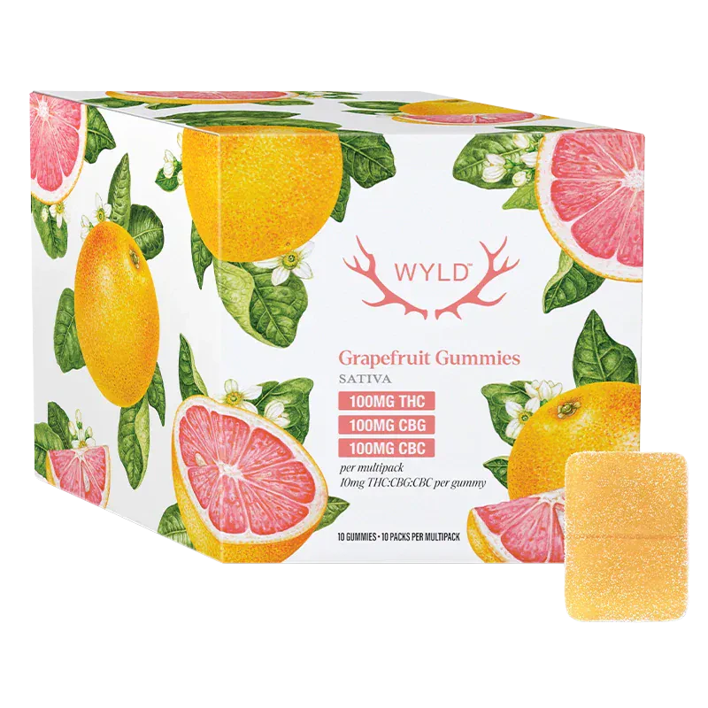 This multipack contains 10 immediate containers, each with one soft chew for a total of 10 soft chews. Wyld Grapefruit Sativa Enhanced THC:CBG:CBC gummies are a 1:1:1 product, made sustainably using real fruit, botanical terpenes and natural flavours. Each gummy contains 10mg THC, 10mg CBG and 10mg CBC, for a total of 100mg THC, 100mg CBG and 100mg CBC per pack. All Wyld gummies are packaged in a fully compostable pouch, and our recipes are formulated by food scientists to provide consistent experiences that taste amazing. Wyld gummies use sunflower lecithin to improve bioavailability and onset time and are made to be thermostable up to 55 degrees C, with a firm texture that doesn't stick to your teeth. Each Wyld Grapefruit Sativa Enhanced gummy contains 10mg THC, 10mg CBG, and 10mg CBC combined with the terpenes limonene, valencene, beta-caryophyllen, alpha-pinene, and beta-pinene for an energetic and uplifting experience.