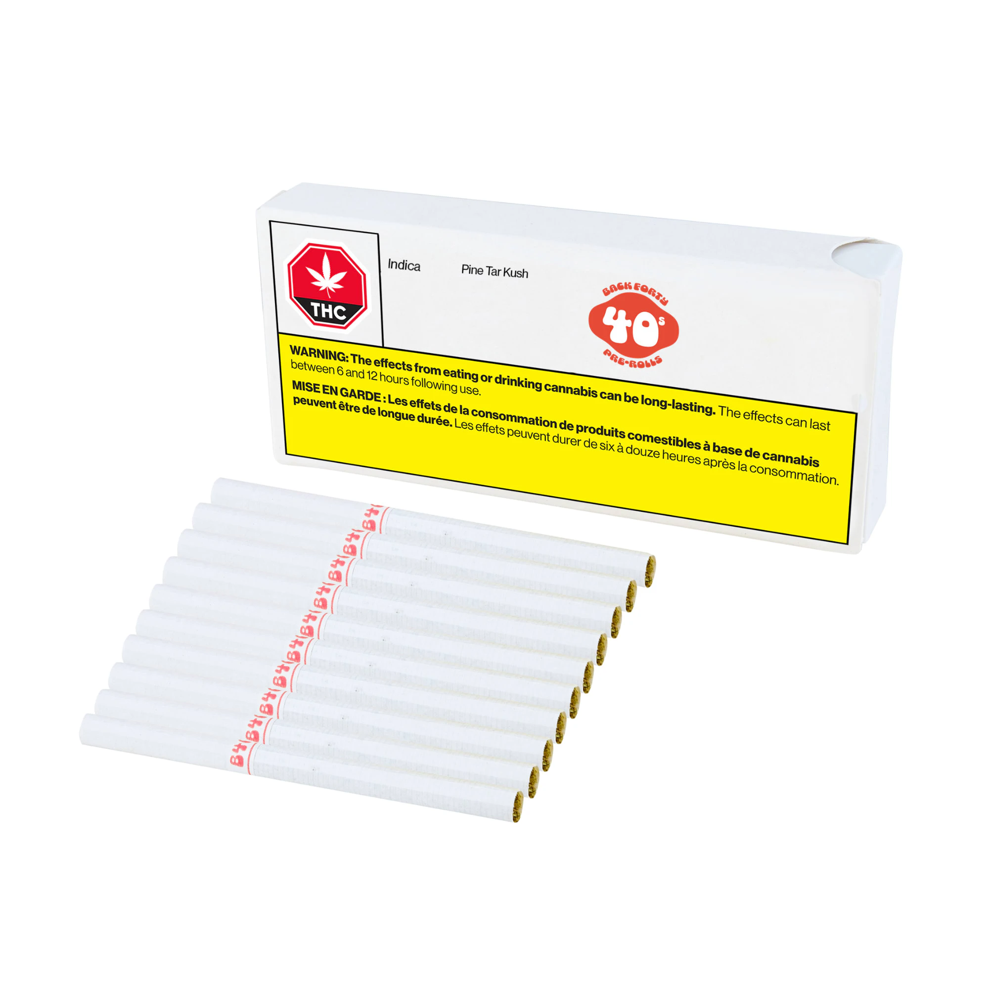 Explore the Back Forty with our Pine Tar Kush slim pre-rolls. A descendant of Pakistani landrace plants, Pine Tar Kush is a potent Indica with a profile of pungent earth and sour pine. 40's use whole flower and are machine-rolled to perfection, packed in a resealable tray.
