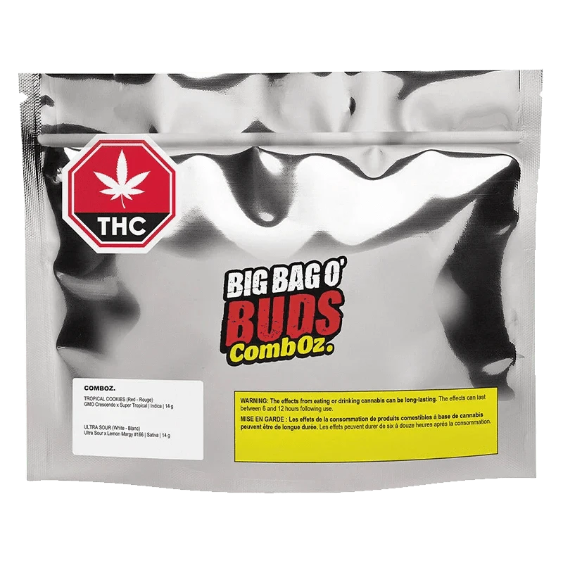 Visit Cannabis 4 Less to dive into the ultimate sativa adventure with the Big Bag o' Buds Combo Oz: Ultra Sour & Tropical Cookies. Explore two 14g bags of big terps, big buds and big highs. Ultra Sour boasts citrus and diesel notes, while Tropical Cookies offers cheesy, peppery aromas with a fruity twist. THC levels 22-28%, all packed in our classic 28g silver bags, with both strains separated for your convenience. At Cannabis 4 Less we have the best.