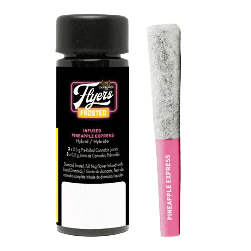 Claybourne Frosted Flyers Infused Pineapple Express pre-rolls are THCa diamond frosted, terpene enhanced and infused with liquid diamonds. These 3x0.5g hybrid pre-rolls boast 40-50% THC. Looking for bold flavour and a potent experience? Look no further than Claybourne Frosted Flyers.