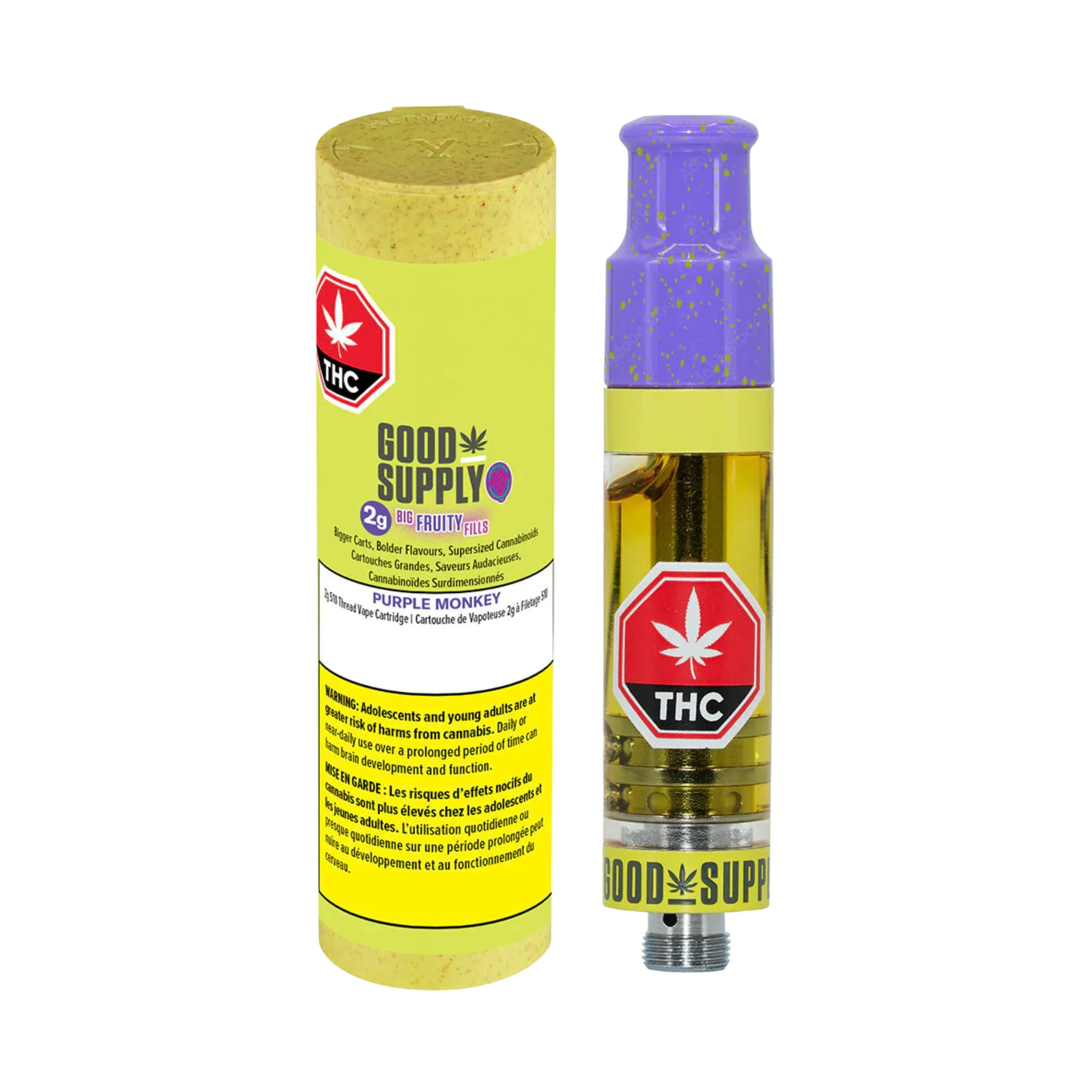 "Purple Monkey 2g 510 Vapes are your new go-to for all-day puffs with bigger carts, bolder flavours and supersized cannabinoid content. The grape, citrus and fruity flavours of Purple Monkey are taken to the max with natural flavouring so concentrated we only need 6% for bold, amped-up flavour you'll savour. Bring home a whopping 1,600mg total cannabinoids, including 1,000mg THC in a 2g fill, so you can spend less time refilling and more time chilling. We cleverly curated this 50% THC, 15% CBG and 15% CBD formulation for a chill, uplifting and daytime-friendly experience. And with a wider mouthpiece for less clogging, you'll be ready for 24/7 heavenly hits with big clouds and smooth, satisfying flavour. The relaxing vibes of Purple Monkey 2g 510 Vapes are ready to rock around the clock."