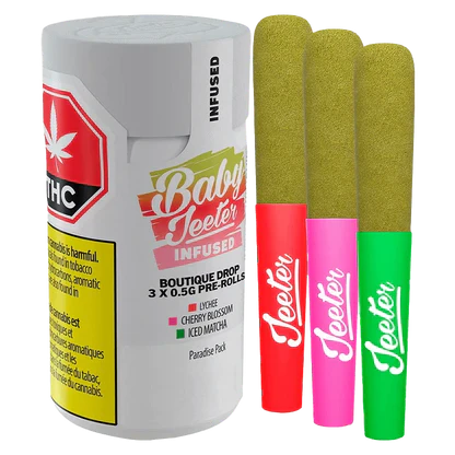 A limited edition pack of Liquid Diamond Infused Baby Jeeter pre-rolls. Every few weeks, we switch it up with new strains, delivering high THC and fresh flavours. Each pre-roll is made with quality buds, infused with liquid diamonds and rolled in our in-house kief for extra potency. More diamonds, more THC and more flavour. Always a consistent burn. And with each drop, you're getting something fresh, high quality and limited edition.