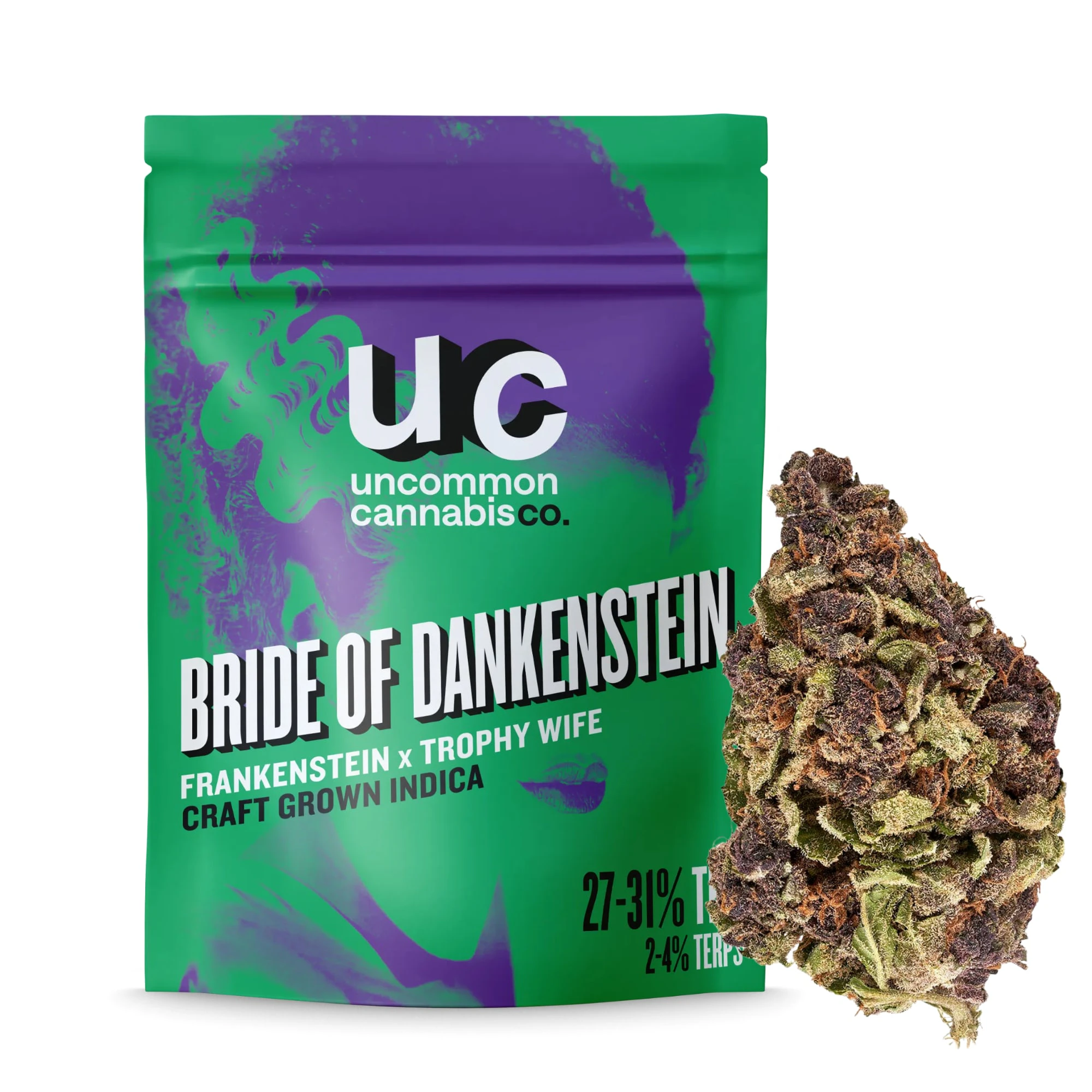 It's Alive! But will leave you dead to the world. Bride of Dankenstein is an Uncommon strain, a result of the matrimony of Frankenstein X Trophy Wife Dank, earthy, piney flavours and a hint of over-ripe fruit. A monsterof a cultivar that delivers what you're looking for in a heavy hitting indica. Escape the ordinary with Uncommon Cannabis.