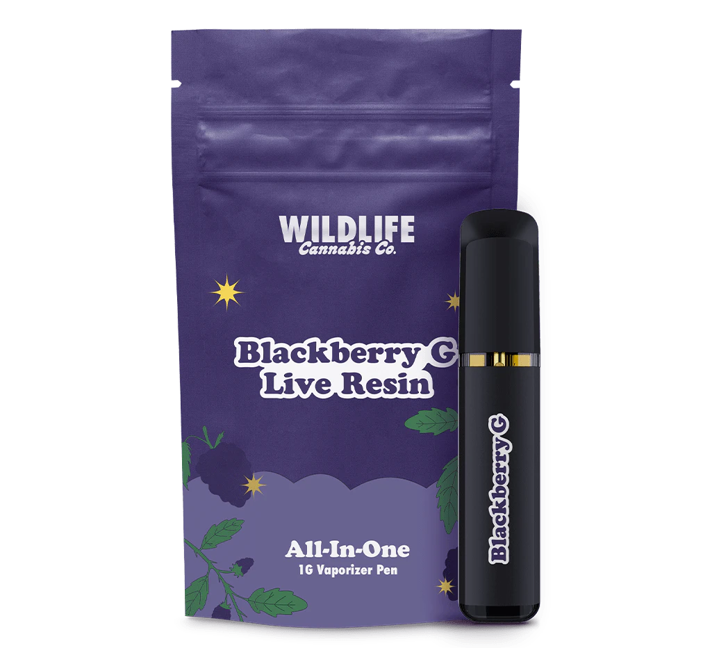 Seeking a true pure live resin vape? Wildlife's Blackberry G Live Resin All in One Vape packs a serious punch of true to strain flavour with no additives, flavouring or fillers. Made from indica dominant single strain fresh frozen cannabis, enjoy the full expression of the flower's terpenes and cannabinoids resulting in a sweet intersection of flavour and potency. Packaged in our 1g, breath activated premium all in one vape hardware for smooth and consistent full-spectrum hits with ease. Ultra discrete, convenient and rechargeable, the Wildlife Blackberry G AIO Live Resin Vape has been designed to optimize flavour and deliver reliable air flow every time. While terpenes will vary by lot this strain often has a myrcene, limonene, caryophyllene and farnesene dominant profile.
