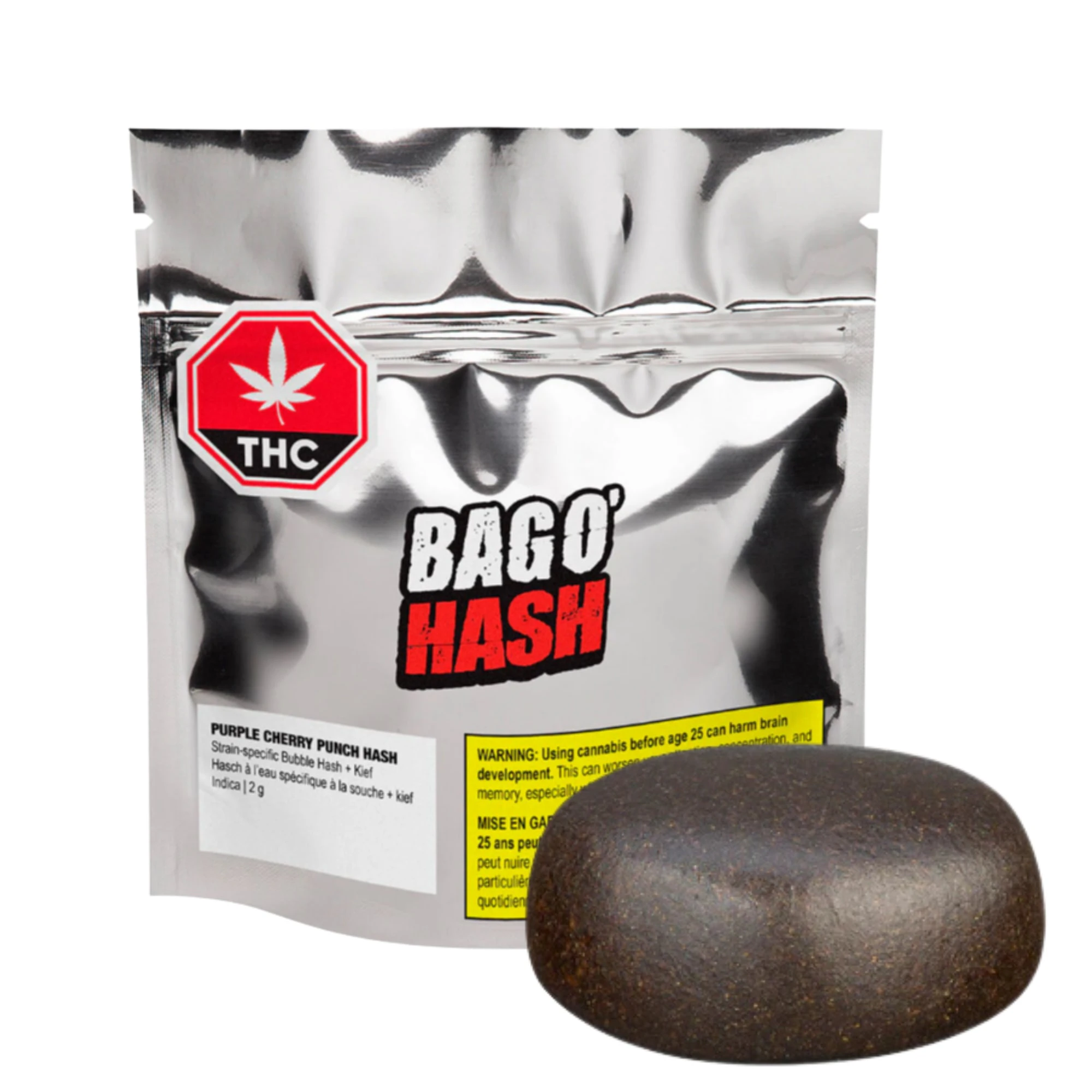 Presenting Purple Cherry Punch Bag O' Hash! Kief is slow-roasted for 12 hours, then combined with ice water extracted bubble hash, and compressed into a dense 2g brick through modern pressing techniques to deliver an unreal traditional hash experience. Highly malleable but flakey when broken open, add this rich and pungent indica to your roll or bowl for a punch of sweet, grape, and berry aromas and a heavy hit of 45% THC.