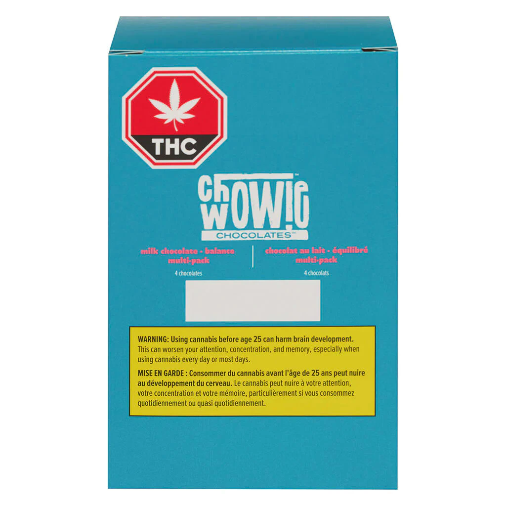 This multipack contains 4 immediate containers, each with one chocolate-for a total of 4 chocolates. The #1 selling chocolate in Canada - balanced milk chocolate is now available in a bulk pack format of 4 units. Chocolate so smooth it could sell water to a fish. Every creamy and smooth Chowie Wowie Milk Chocolate Balance contains one piece of quality milk chocolate with equal amounts of THC and CBD, 10mg each. Breakable into two servings, it's perfect for sharing. Leveraging 100% THC and CBD distillate, Chowie Wowie Milk Chocolate Balance provides consistent dosing per serving. Start with 1 square then wait to feel the effects.