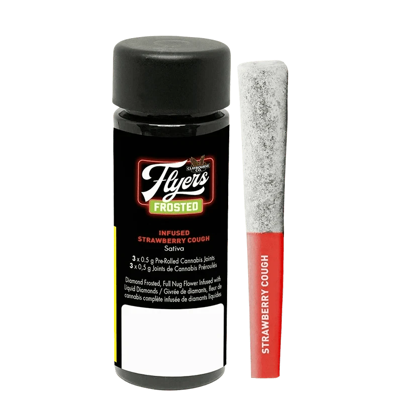 Claybourne Frosted Flyers Infused Strawberry Cough pre-rolls are THCa diamond frosted, terpene enhanced and infused with liquid diamonds. These 3x0.5g pre-rolls are sativa-dominant and boast 40-50% THC. Looking for bold flavour and a potent experience? Look no further than Claybourne Frosted Flyers.