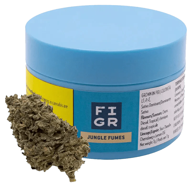 Stop and smell the Jungle Fumes These dense Jungle-coloured buds are packed with diesel and chem flavours! This sativa comes with heavy diesel aromas upfront, chem undertones and notes of tropical fruits, Jungle Fumes will take you on a jungle cruise through your senses! FIGR dried flower products are hand selected to ensure dense, high-quality buds are in every package.
