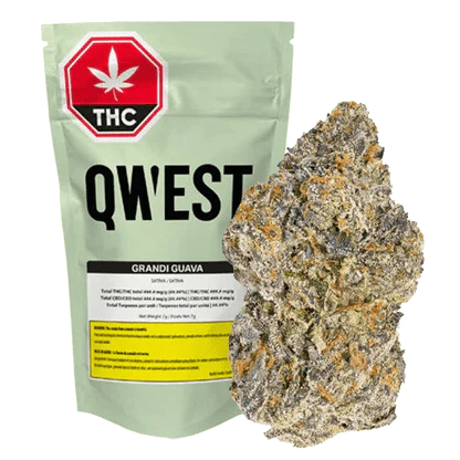 "Big on quality. Grandi on flavour. Purple buds covered with orange hairs and trichomes. Grandi Guava is a Guava x Gelato cross, busting with a fruit and cheese aroma and a spicy, tropical taste. Say goodbye to overpriced mediocrity. Qwest flower is crafted in small batches and hang-dried to keep its natural flavours and potency. Consistent craft quality without the sticker shock. More Dank. Less Bank - The truth is in the bag."