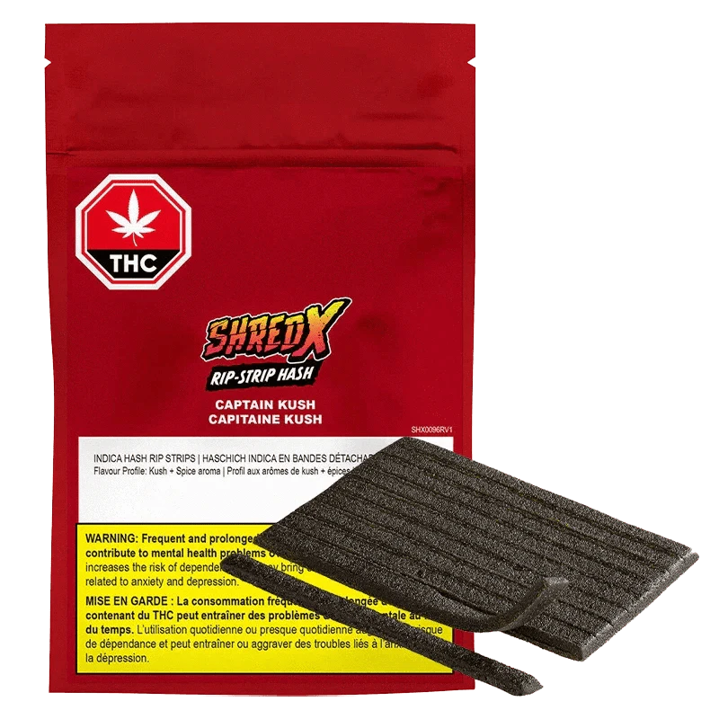 The almighty Captain Kush is ready to join the fight against boring old sessions. SHRED X Captain Kush Rip-Strip hash is a 2g piece of botanical terpene-infused hash pressed flat and cut into 10 easy-to-use hash strips. A perfect addition for added flavour and potency in your roll or bowl, simply rip-it, strip-it & go to infuse your session with 40 - 46%+ potency and the distinctive gassy, floral kush-like aromas of Captain Kush.