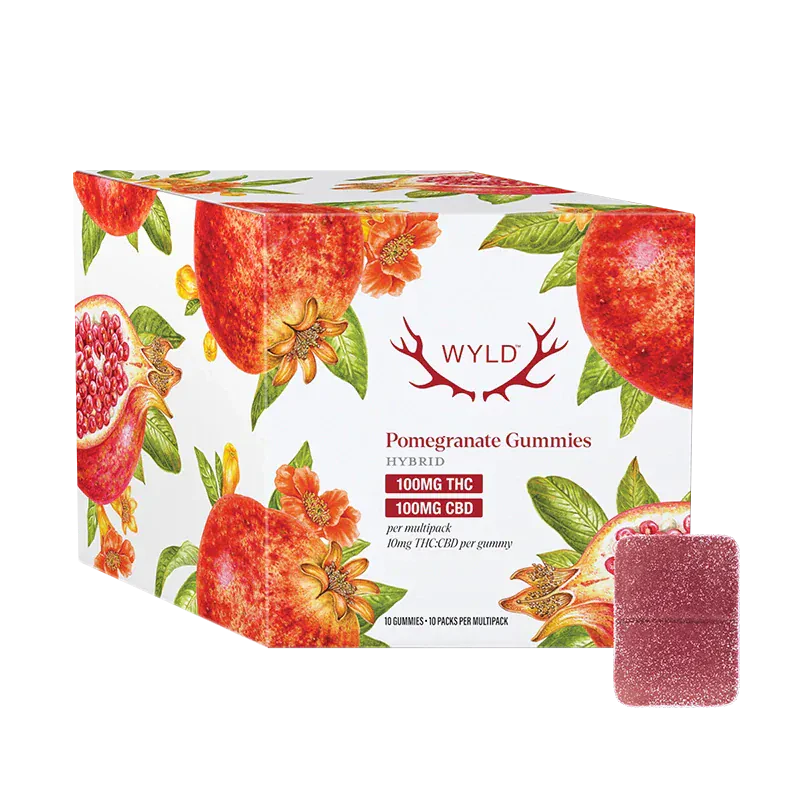 This multipack contains 10 immediate containers, each with one soft chew for a total of 10 soft chews. Wyld Pomegranate Enhanced THC:CBD gummies are a 1:1 product, made sustainably using real fruit, botanical terpenes and natural flavours. Each gummy contains 10mg THC and 10mg CBD, for a total of 100mg THC and 100mg CBD per pack. All Wyld gummies are packaged in a fully compostable pouch, and our recipes are formulated by food scientists to provide consistent experiences that taste amazing. Wyld gummies use sunflower lecithin to improve bioavailability and onset time and are made to be thermostable up to 55 degrees C, with a firm texture that doesn't stick to your teeth. Each Wyld Pomegranate Hybrid Enhanced gummy contains 10mg THC and 10mg CBD combined with the terpenes limonene, linalool, alpha-pinene, and beta-pinene for a euphoric and relaxed experience.